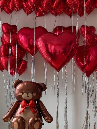 - Фольгированные шары-сердца: Прочные, яркие и долговечные. Они сохраняют форму и идеально подходят для фотосессий.